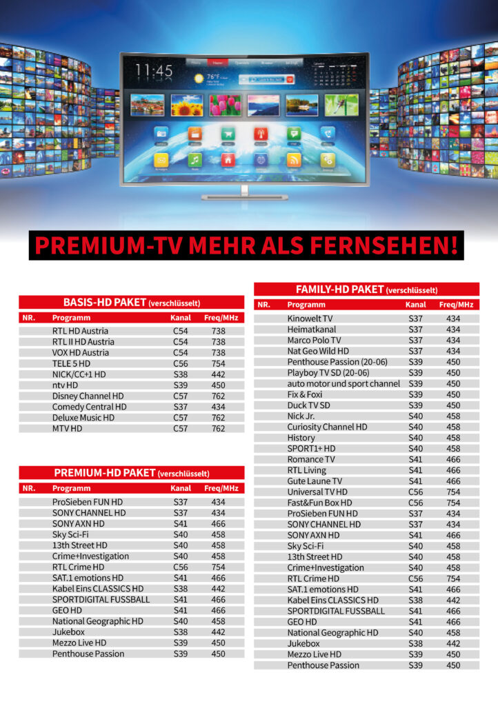 - HD-Austria und SKY Programme (gesonderte Anmeldung erforderlich)